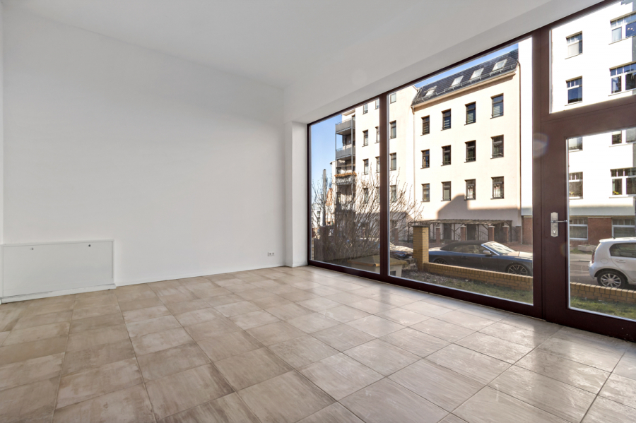 Ein besonderes Highlight ist die große Schaufensterfront, die Ihnen eine hervorragende Sichtbarkeit garantiert. Der Zugang zur Fläche erfolgt sowohl direkt von außen als auch über den Hausflur, was eine flexible Nutzung ermöglicht. Die Gewerbefläche ist komplett gefliest und verfügt über eine komfortable Fußbodenheizung, die für ein angenehmes Raumklima sorgt.