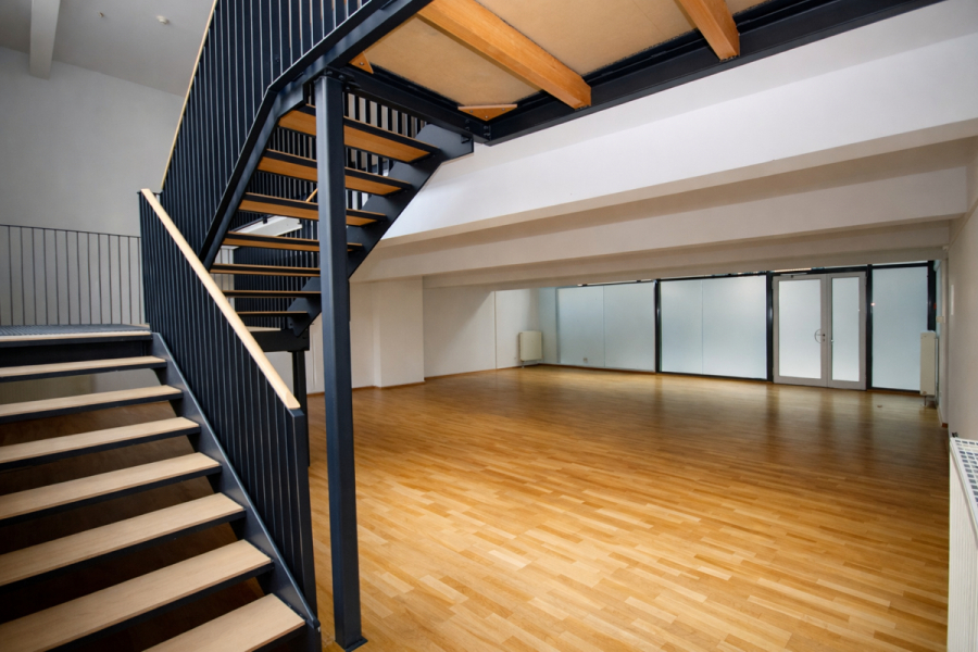 Inmitten der lebendigen Altstadt befindet sich diese attraktive Gewerbefläche mit einer Gesamtgröße von ca. 185 m², verteilt auf zwei Ebenen. Die Ebenen sind in moderner Loftoptik gestaltet und über eine hochwertige Stahltreppe miteinander verbunden, was der Einheit ein besonderes architektonisches Ambiente verleiht.
