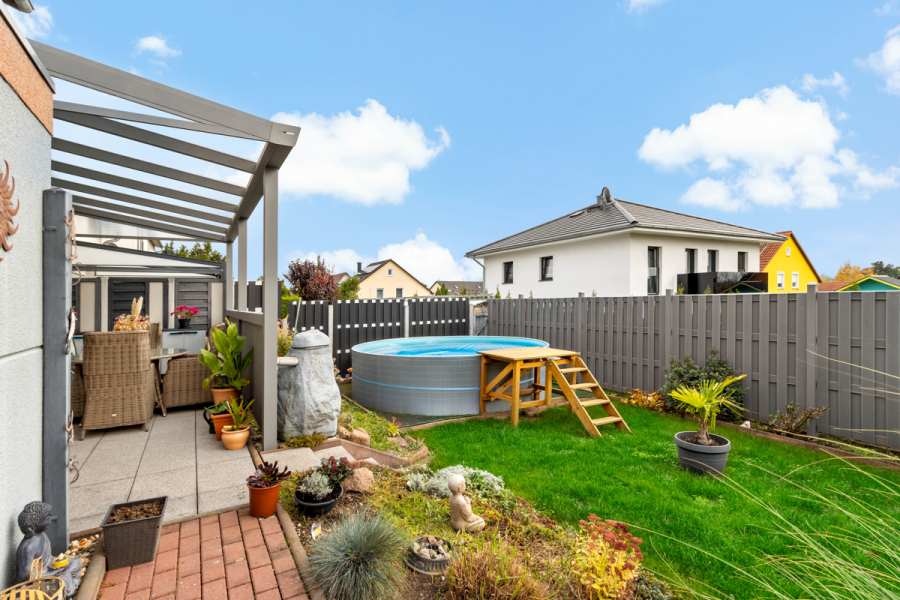 Die Kinder lassen Sie einfach im Pool planschen und danach im Garten ordentlich austoben.