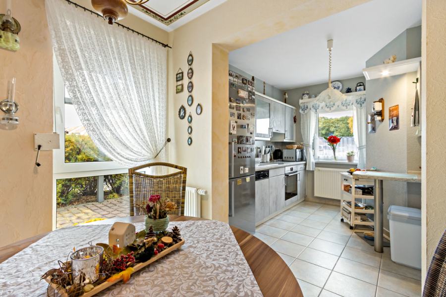 Im Erdgeschoss befinden sich das große helle Wohnzimmer , die offen gestaltete Küche mit Essbereich und neben dem Gäste-WC auch ein Hauswirtschaftsraum.