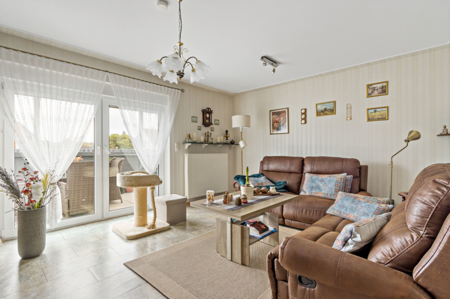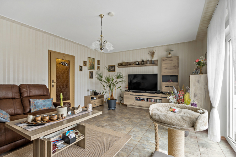 Vom Wohnzimmer aus gelangen Sie auf Ihre Sonnenterrasse mit Rundumblick in Ihren Garten.