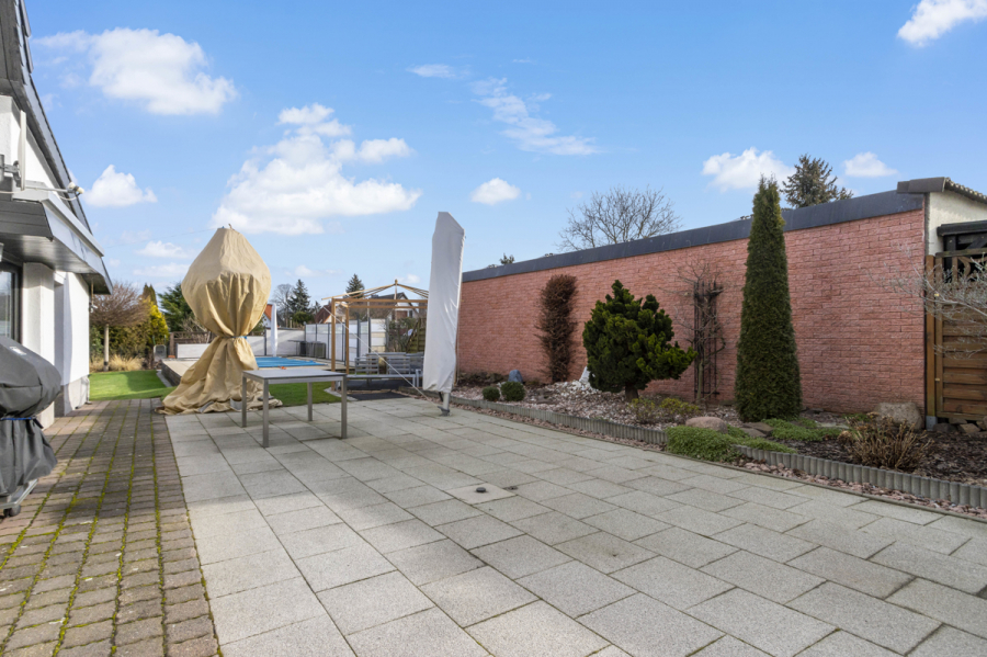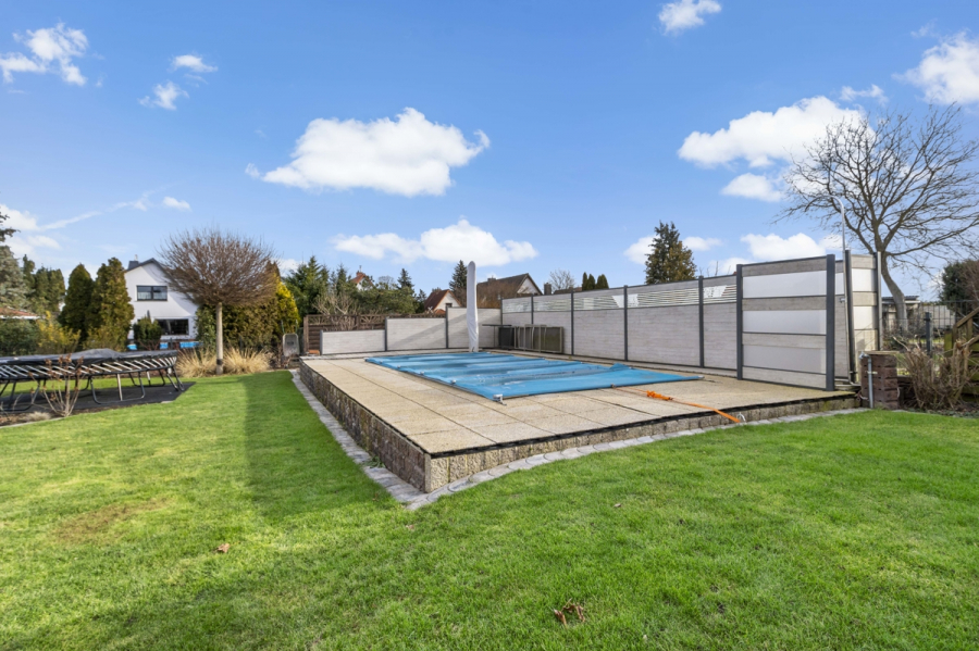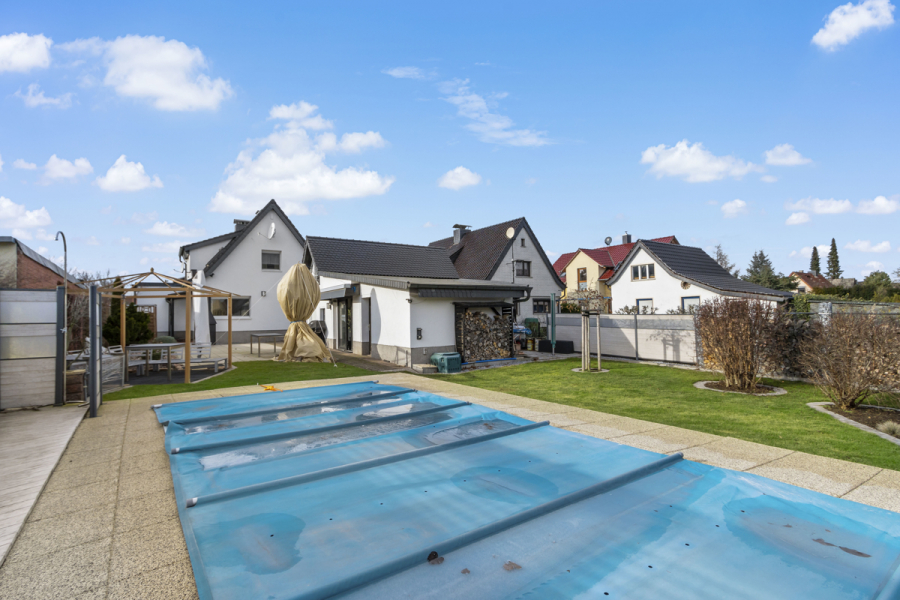 Ruhig gelegen und umgeben von einem sehr gepflegten Grundstück mit toller Poolanlage bietet das neue Domizil mit seinem ausgebauten Nebengelass, der Freiterrasse und der Garage viel Raum zur Erholung und Entspannung mit Freunden.