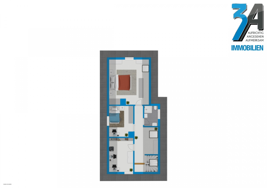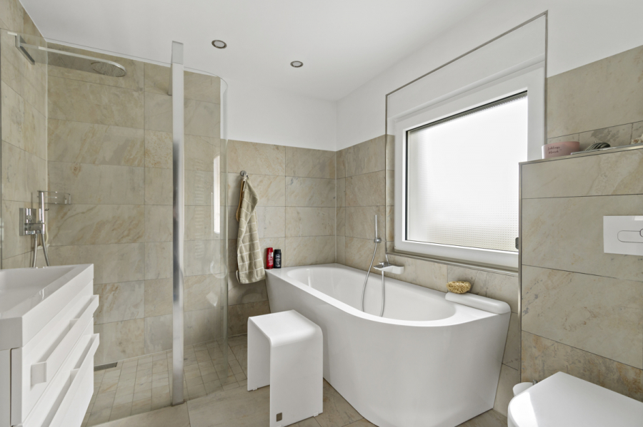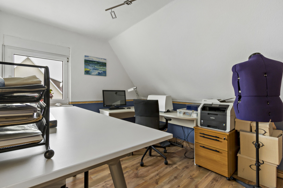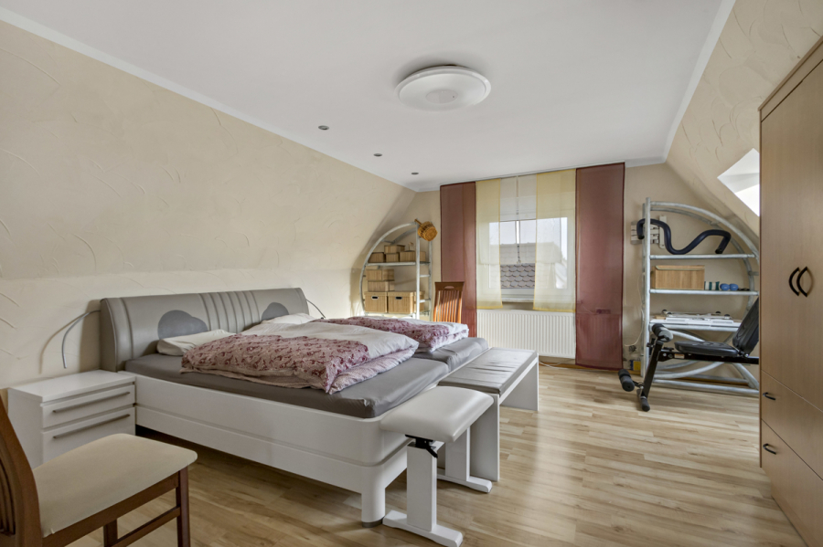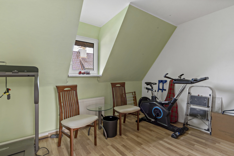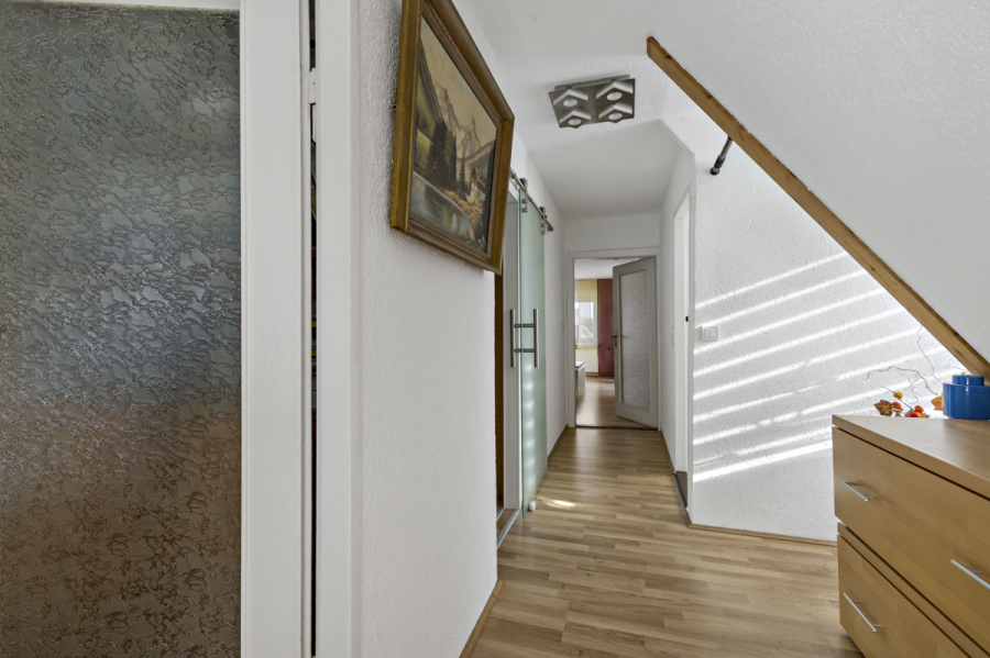Über eine Treppe gelangen Sie in das Obergeschoss mit 3 weiteren Räumen und dem zweiten Bad mit Dusche.