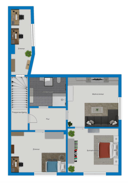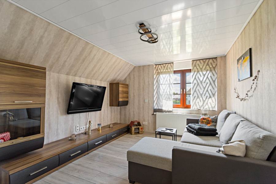 Ihr Wohnzimmer, das Schlafzimmer und ein weiteres Zimmer erreichen Sie über eine Treppe im Dachgeschoss.