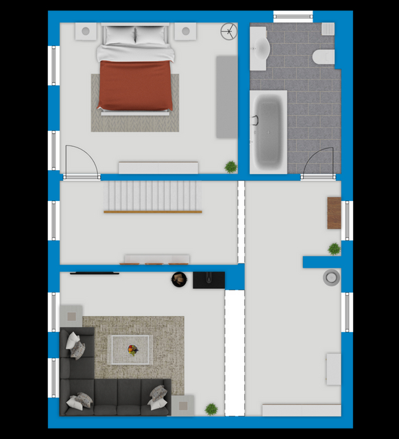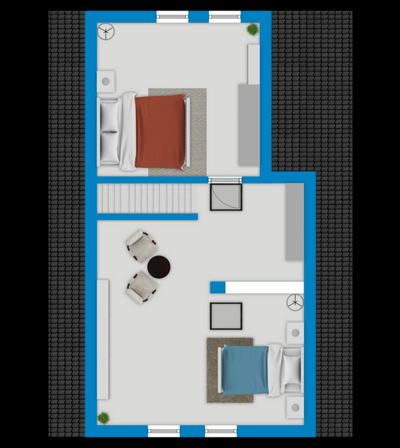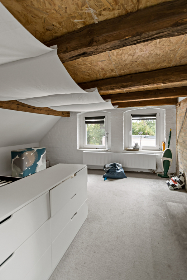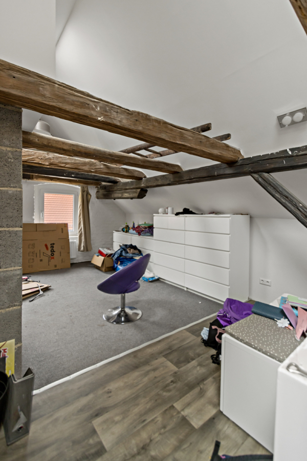 Das Obergeschoss beherbergt ein gemütliches Wohnzimmer mit Kamin, ein weiteres Schlafzimmer sowie das Hauptbadezimmer mit Badewanne. Im Dachgeschoss stehen zwei zusätzliche Zimmer zur Verfügung, die sich ideal als Kinder- oder Jugendzimmer eignen.
