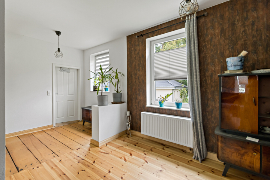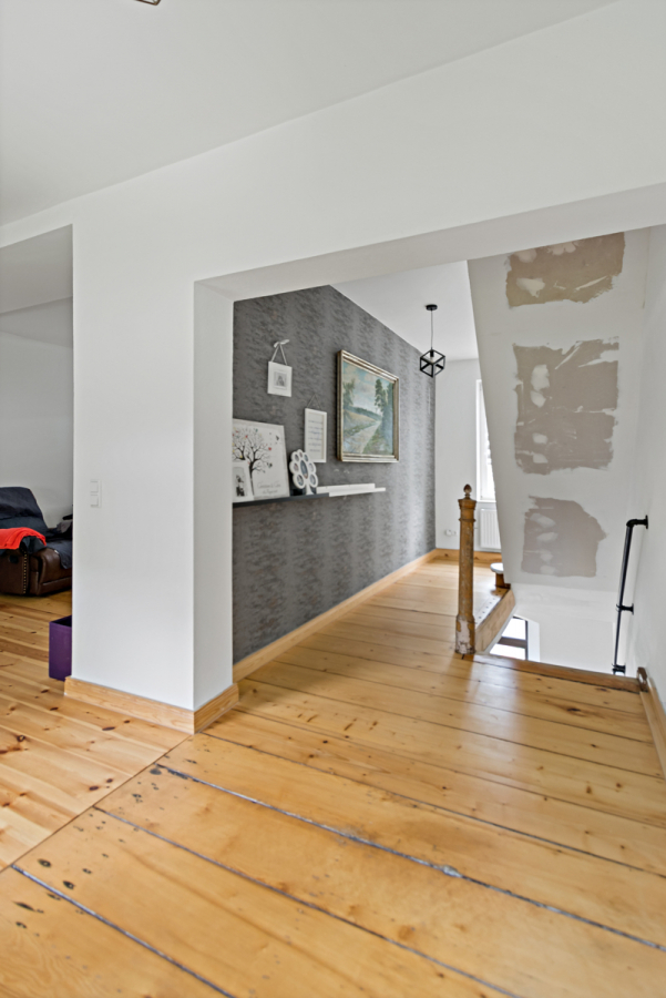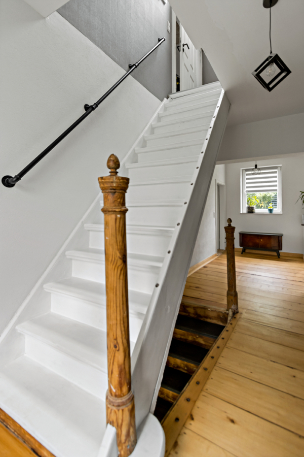 In den Jahren 2021 bis 2022 wurde die Immobilie umfassend saniert und modernisiert. Dabei wurde das Dach vollständig erneuert und gedämmt, die Elektrik komplett erneuert und eine neue Gasheizung installiert. Im gesamten Erdgeschoss sorgt eine moderne Fußbodenheizung für angenehme Wärme. Die Fenster im Erdgeschoss wurden ausgetauscht und durch neue, energieeffiziente Modelle ersetzt. Das massive 62er Mauerwerk erhielt einen neuen Putz, und im Obergeschoss konnte der vorhandene Dielenboden fachgerecht aufgearbeitet und wiederverwendet werden – ein schönes Beispiel für die sorgfältige Verbindung von Alt und Neu. Die Fassade wurde in teilweise aufwendiger Handarbeit gereinigt und hydrophobiert, um das historische Erscheinungsbild zu bewahren und gleichzeitig langfristig zu schützen. So entsteht ein behagliches und zugleich energieeffizientes Wohnklima.
