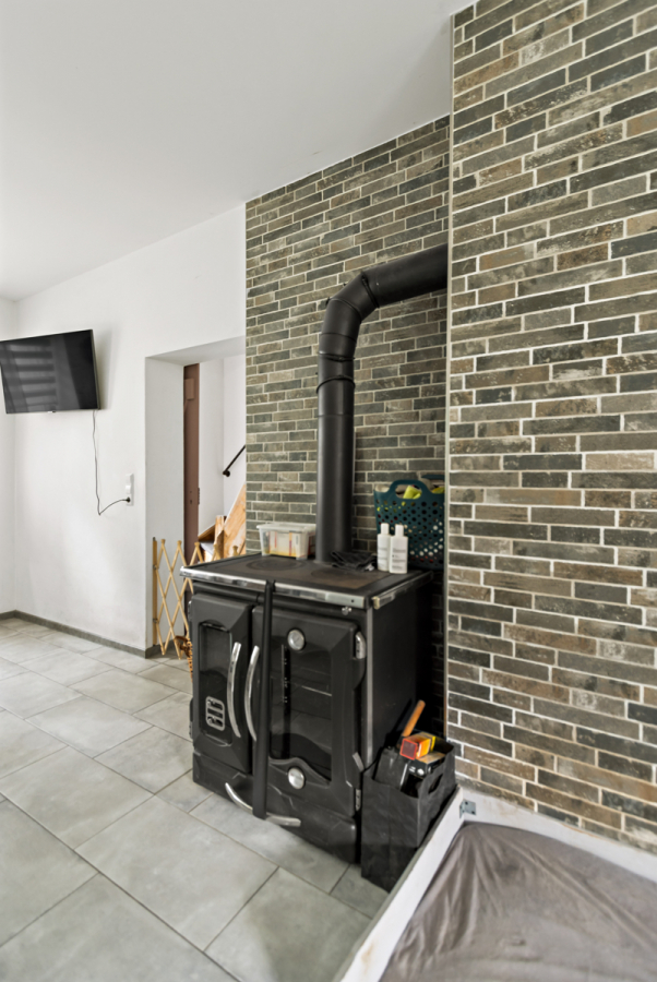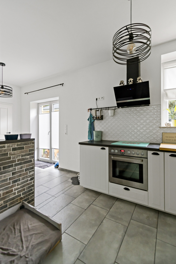 Die Wohnfläche verteilt sich auf drei Etagen, wobei das Haus nicht unterkellert ist. Im Erdgeschoss befinden sich eine großzügige Wohnküche mit einem stilvollen, auf alt getrimmten Ofen als zentralem Blickfang, ein geräumiges Schlafzimmer sowie ein kombinierter Hauswirtschaftsraum mit Dusche, in dem sich auch die Heizungsanlage befindet.