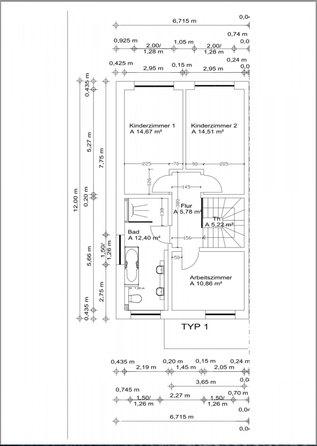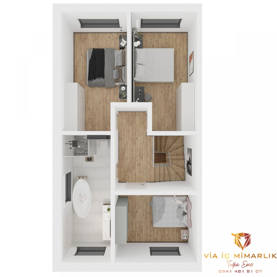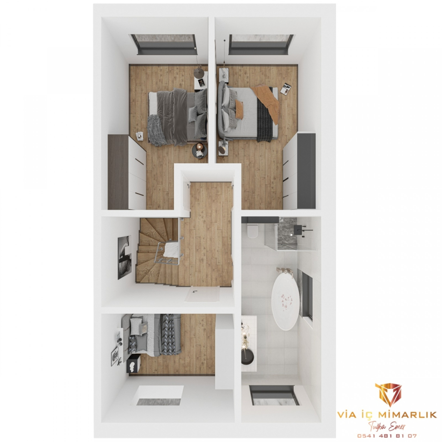 Über eine moderne Treppe gelangen Sie in das 1.OG. Hier werden drei weitere Zimmer für Ihre Kinder und Büro zur Verfügung stehen. Das Masterbad mit Wanne, Dusche und Doppelwaschbecken wurde auch im 1.OG geplant.