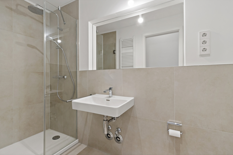 Das Badezimmer ist modern ausgestattet und verfügt über eine ebenerdige Dusche, die den zeitgemäßen und komfortablen Anspruch der Wohnung abrundet.