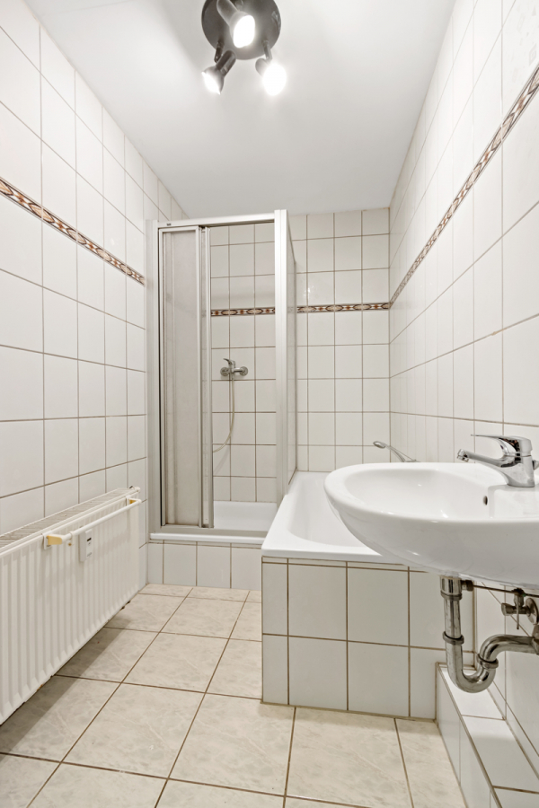 Ihr gefliestes Badezimmer ist ausgestattet mit einer Badewanne und einer Dusche. Des Weiteren verfügt es über einen Waschmaschinenanschluss.