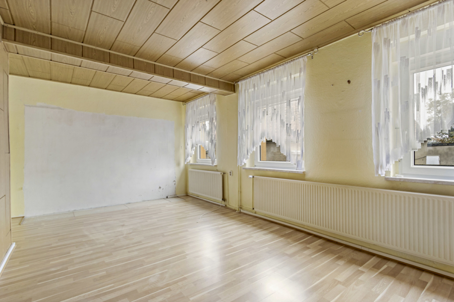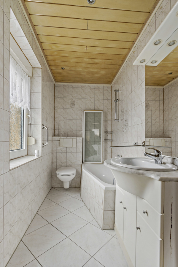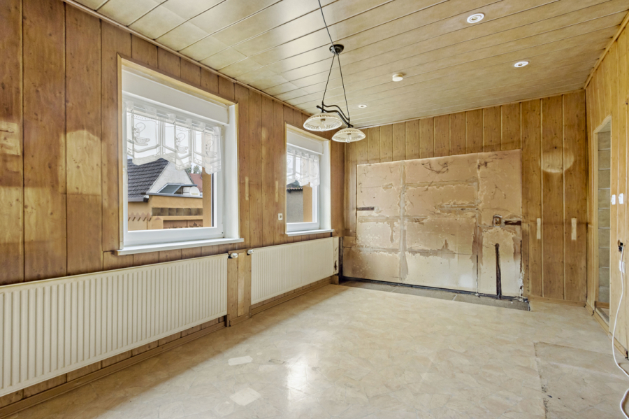 Das Erdgeschoss ist der Herzschlag des Hauses. Ein separater Anbau dient als großzügiger Dielenbereich und führt Sie in die Räume der unteren Wohnebene. Hier befinden sich das Wohnzimmer, eine geräumige Küche und das Badezimmer mit Wanne.
