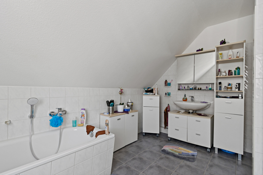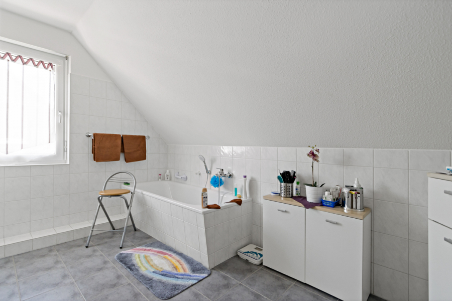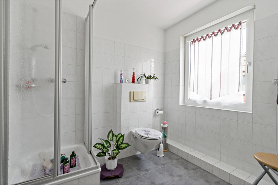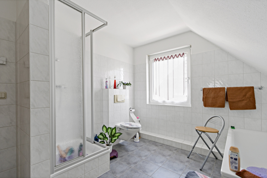 Ein Highlight dieses Stockwerks ist das Hauptbadezimmer, das mit einer komfortablen Dusche, einer einladenden Badewanne und einem Fenster für angenehmes Tageslicht ausgestattet ist - ein Ort der Erholung und Entspannung.