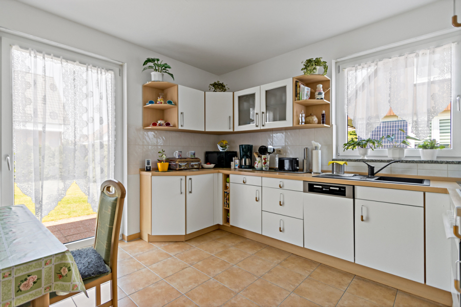 Das Erdgeschoss empfängt Sie mit einem großzügigen und lichtdurchfluteten Wohnzimmer, welches nicht nur zum Entspannen einlädt, sondern auch einen direkten Zugang zur Terrasse bietet. Die Küche ist der perfekte Ort, um kulinarische Köstlichkeiten zu zaubern.