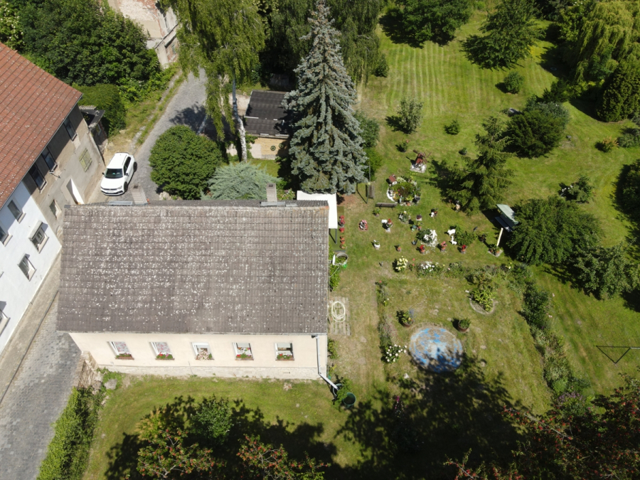 - Auf dem Grundstück befinden sich eine Doppelgarage, zwei Schuppen und eine eingestürzte Scheune (Ruine)