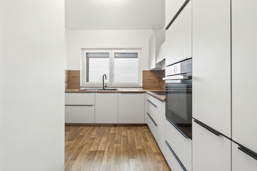 Das Erdgeschoss besticht durch ein helles, weitläufiges Wohnzimmer, welches mit bodentiefen Fenstern viel Tageslicht bietet und direkten Zugang zur Terrasse mit kleinem Garten gewährt. Eine moderne Einbauküche, die Diele, der Abstellraum sowie ein Gäste-WC runden diese Ebene ab.