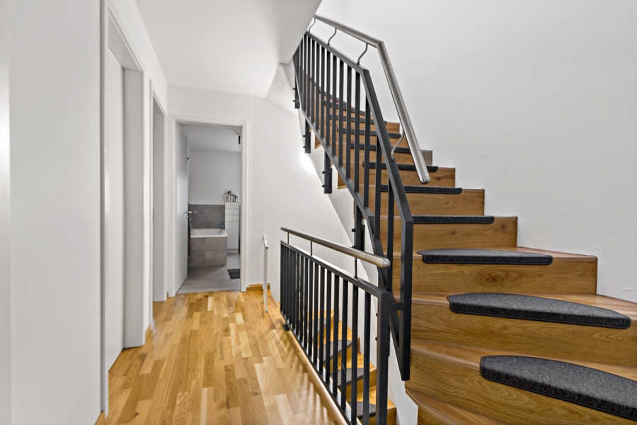 Im 1. Obergeschoss erwarten Sie zwei Schlaf- bzw. Wohnräume, ideal nutzbar für Familie, Büro oder Hobby. Auf dieser Etage befinden sich außerdem ein Heizungsraum sowie ein separater Hauswirtschaftsraum. Das komfortable Tageslichtbad mit Badewanne und Dusche sorgt hier zusätzlich für hohen Wohnkomfort.
