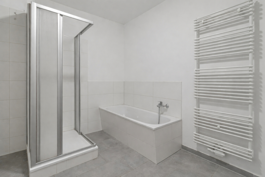 Ihr modernes Badezimmer ist mit einer Dusche und einer Wanne ausgestattet und verfügt über einen Waschmaschinenanschluss.