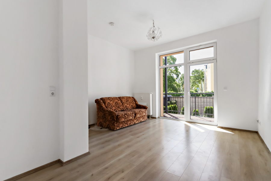 Von der Diele aus gelangen Sie sowohl in das helle Schlafzimmer als auch in das Wohnzimmer mit offener Küche und Balkon.