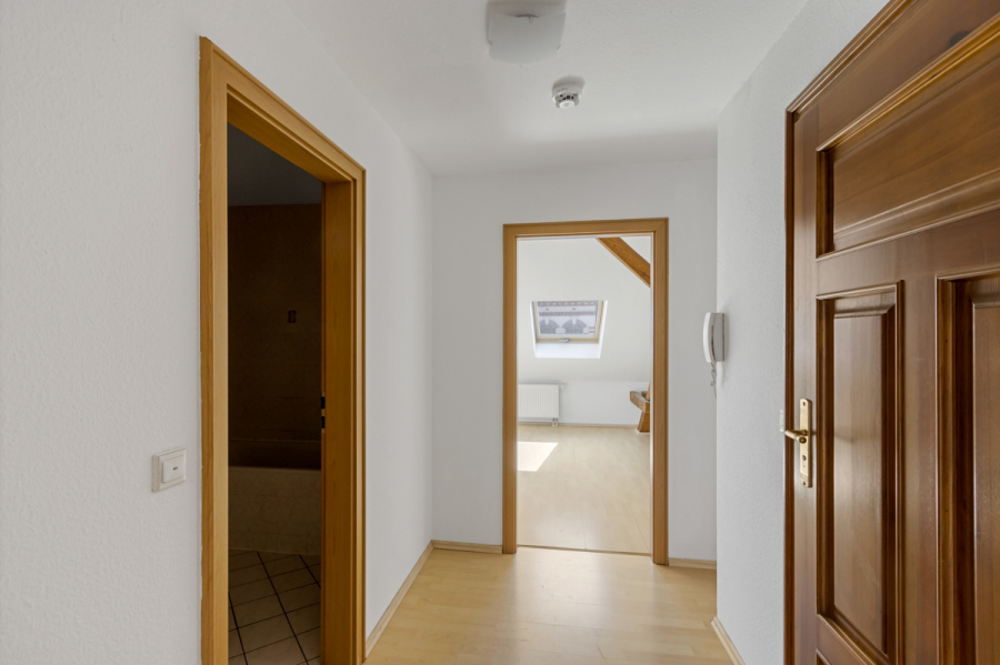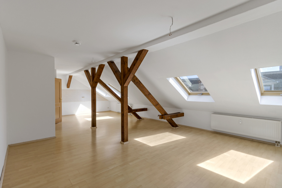 Vom Flur gelangen Sie in das helle Wohnzimmer mit offener Küche, das durch seine offene Gestaltung und die Dachschrägen eine besonders wohnliche Atmosphäre erhält.