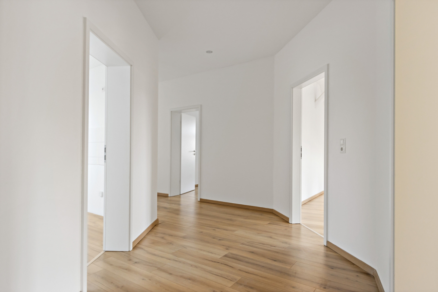 Abgesehen vom Wohnzimmer hast Du mit den vier weiteren Zimmern jede Menge Möglichkeiten: drei separate Schlafzimmer für Family oder Gäste – plus ein extra Zimmer als Homeoffice, Gaming- oder Kreativraum. Das Badezimmer ist praktisch und zeitlos, und der Laminatboden sorgt überall für einen cleanen, wohnlichen Look.