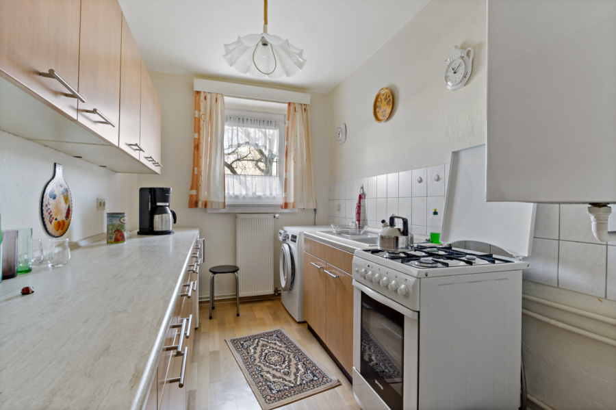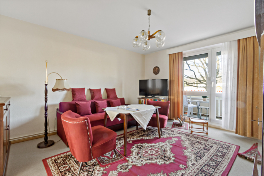 Das geräumige Wohnzimmer bildet das Herzstück der Wohnung und bietet direkten Zugang zum Balkon, der einen angenehmen Platz im Freien schafft. Das ebenfalls großzügig geschnittene Schlafzimmer sorgt für ausreichend Platz und Rückzugsmöglichkeiten. Die Küche ist im klassischen Altneubau Stil aus den 1960er Jahren geschnitten und bietet somit eine funktionale Raumnutzung. Das Badezimmer ist mit einer Wanne sowie einem Fenster ausgestattet und sorgt für eine angenehme Atmosphäre.