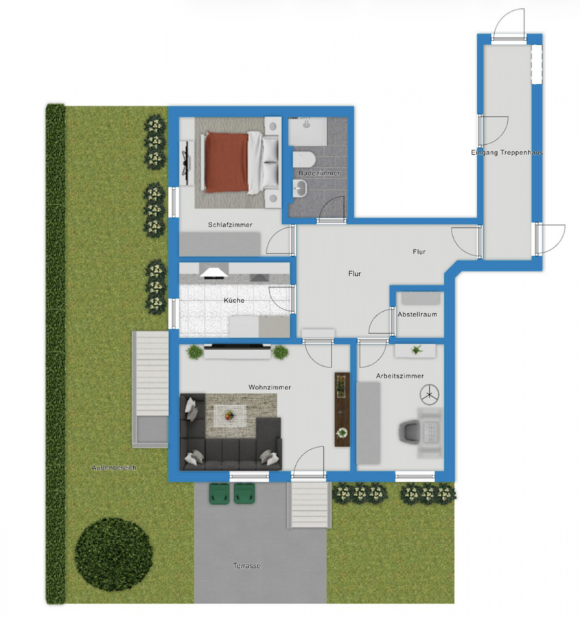 Das Terrassenbild wurde mittels KI-Visualisierung mit Terrassenmöbeln ausgestattet, um eine mögliche Gestaltung darzustellen.