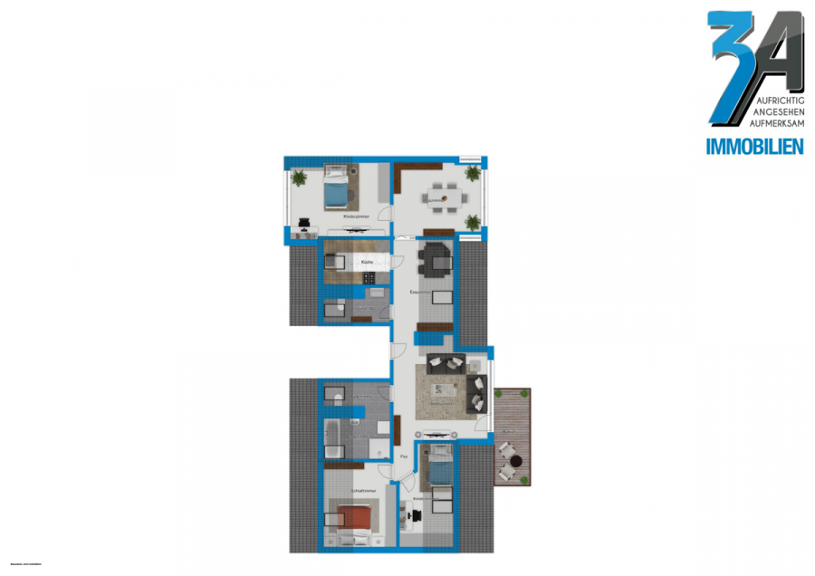 - 5 gut geschnittene Zimmer (Wohnzimmer, Esszimmer, Schlafzimmer, 2 Kinderzimmer, Arbeitszimmer)
