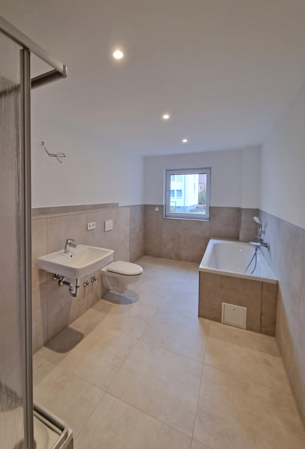 Die Bäder wurden hell und freundlich mit modernen großen Fließen saniert. Eine Glaswanddusche gehört hier zusätzlich zur Badewanne zum Standard. Alle Fenster sind mit elektrischen Rollläden versehen.