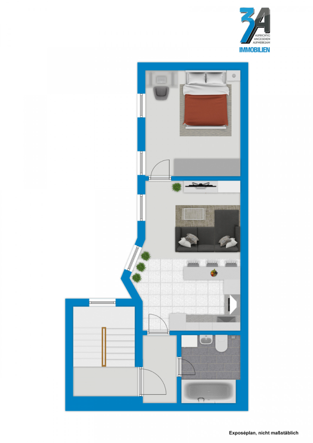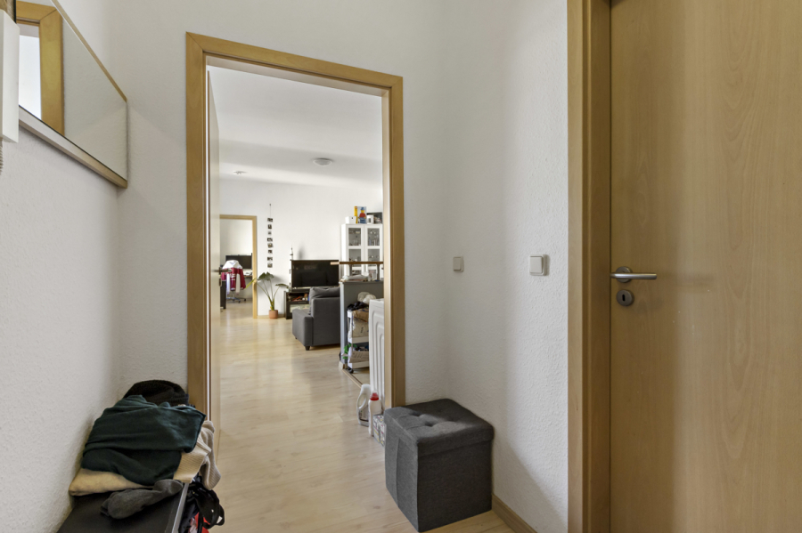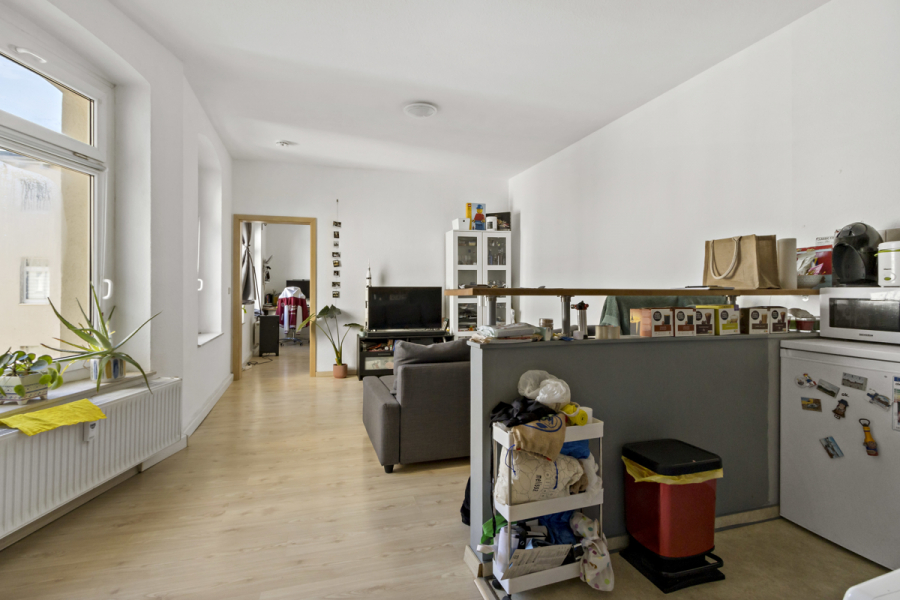 Auf ca. 46 m² erwartet Sie sowohl ein geräumiges Wohnzimmer, als auch ein helles Schlafzimmer. Dieses erreichen Sie nur über das Wohnzimmer. Somit ist die Wohnung für eine 2er WG ungeeignet.