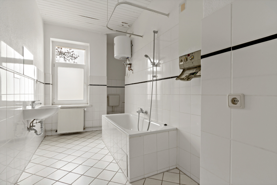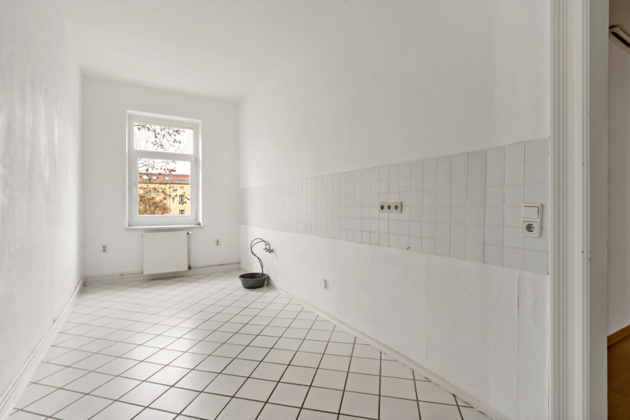 Die Küche ist schlauchartig geschnitten und funktional angelegt, sodass sich der vorhandene Raum effizient nutzen lässt. Das Tageslichtbad ist mit einer Badewanne ausgestattet und bietet dank Fenster eine natürliche Belüftung.