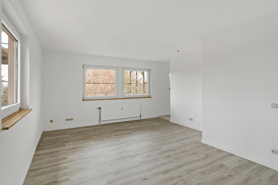 Das Herzstück der Wohnung bildet das großzügige Wohnzimmer mit angrenzender, offen gestalteter Küche. Dieser Bereich lädt zum entspannten Verweilen und gemeinsamen Leben ein. Ein pflegeleichter Laminatboden sorgt in allen Wohnräumen für ein angenehmes und behagliches Wohngefühl.